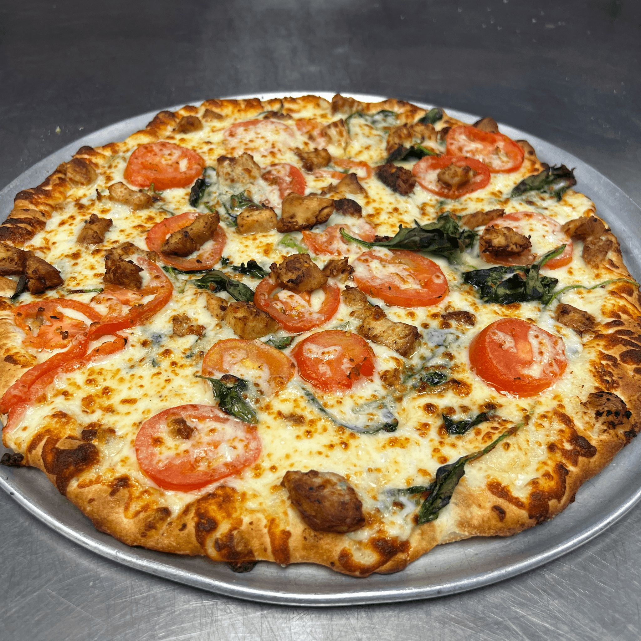 Grilled chicken, spinach, tomatoes, fresh garlic, Italian herbs, no sauce, topped with a load of mozzarella cheese. For 18" best value (4 ppl), original hand-tossed crust only