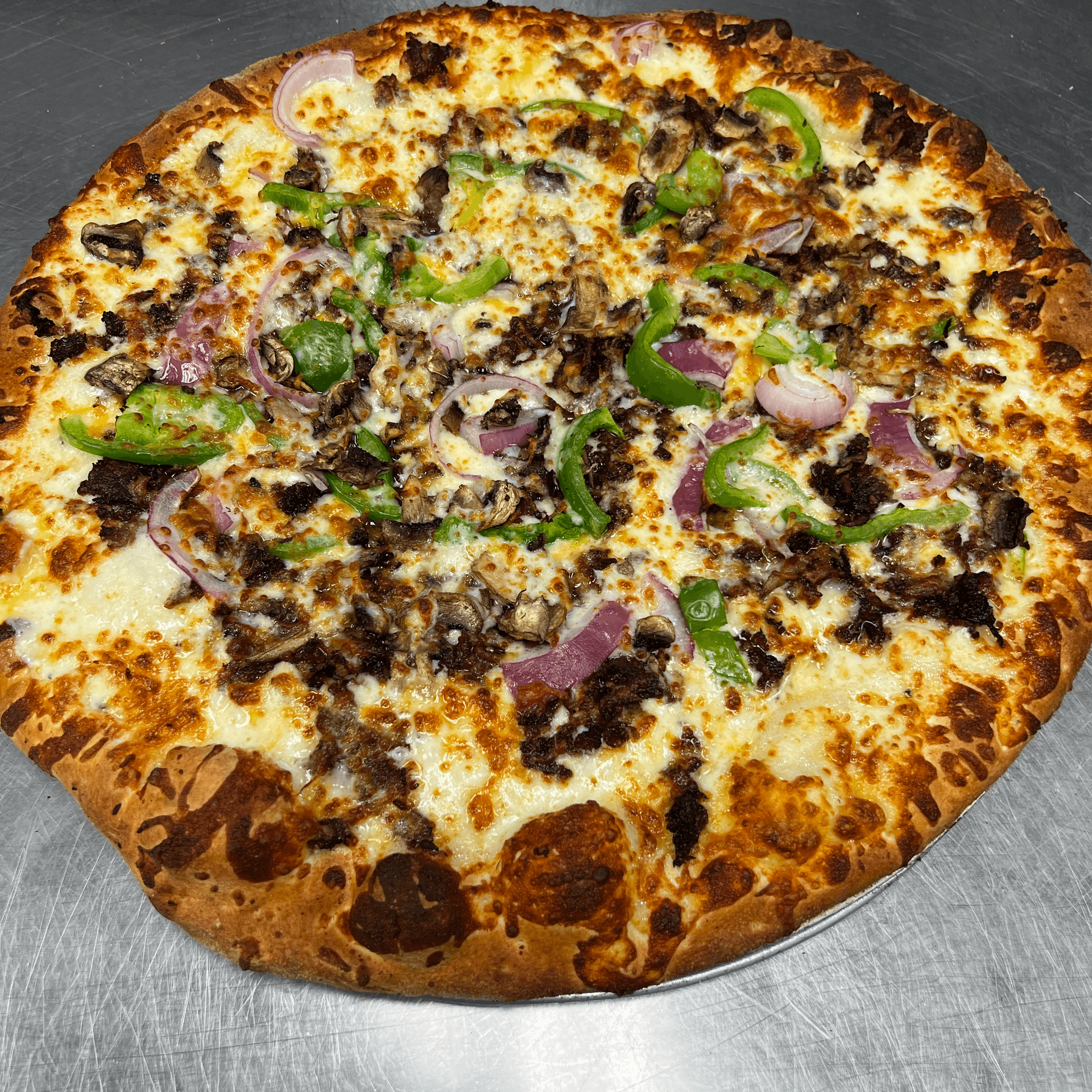 Pepperoni, sausage, mushrooms, red onions, and green peppers