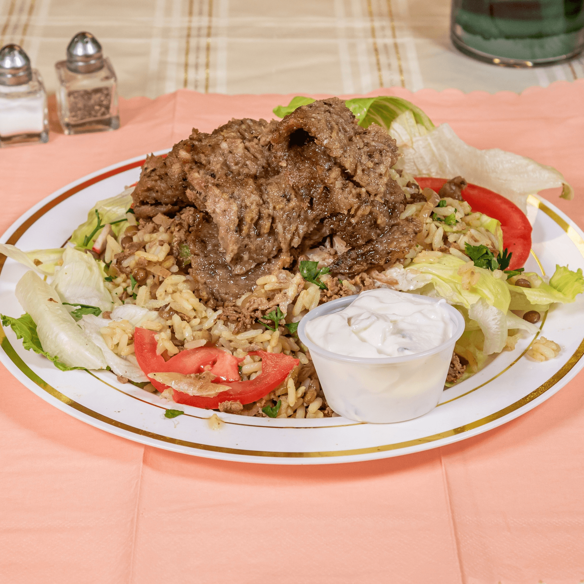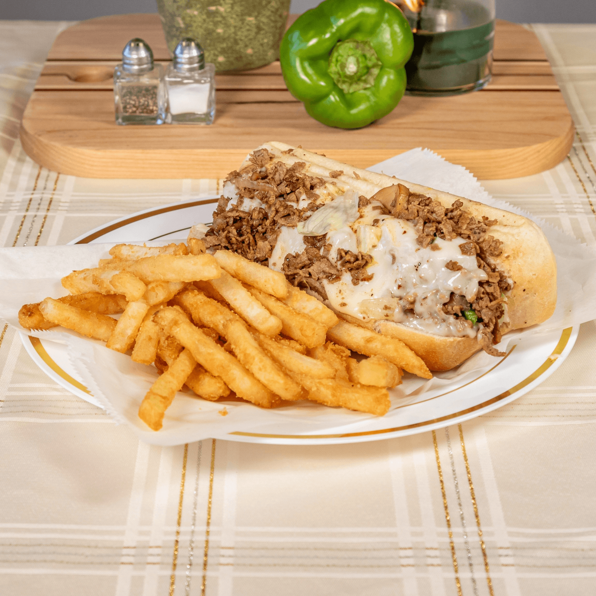 Provolone cheese, mushrooms, caramelized onions, mayonnaise, lettuce, tomatoes, and green peppers. Add toppings upon request. Extra cheese and meat for an additional charge.